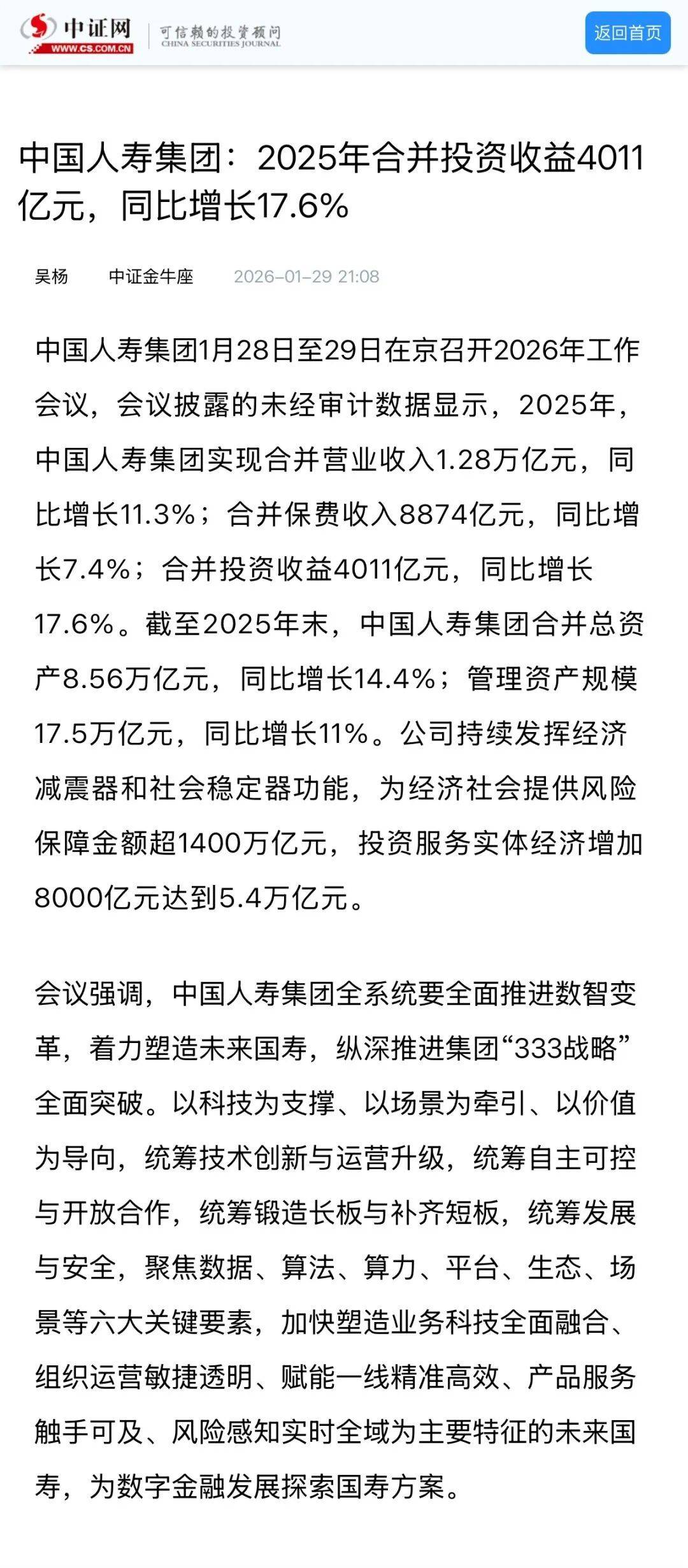2026年1月28日至29日,中国人寿在京召开2026年工作会议、2026年全面从严治党暨纪检监察工作会议。会议指出,2025年,全系统经营绩效再创新高,集团合并营业收入1.28万亿元,同比增长11.3%;合并保费收入8874亿元,同比增长7.4%;合并投资收益4011亿元,同比增长17.6%;合并净利润大幅增长;合并总资产8.56万亿元,同比增长14.4%;管理资产规模17.5万亿元,同比增长11%。经济减震器和社会稳定器功能更好发挥,为经济社会提供风险保障金额超1400万亿元,投资服务实体经济增加8000亿元达到5.4万亿元。风险防控有力有序有效,寿险公司、财险公司、养老险公司风险综合评级,资产管理公司年度监管评级均获行业最高等级。