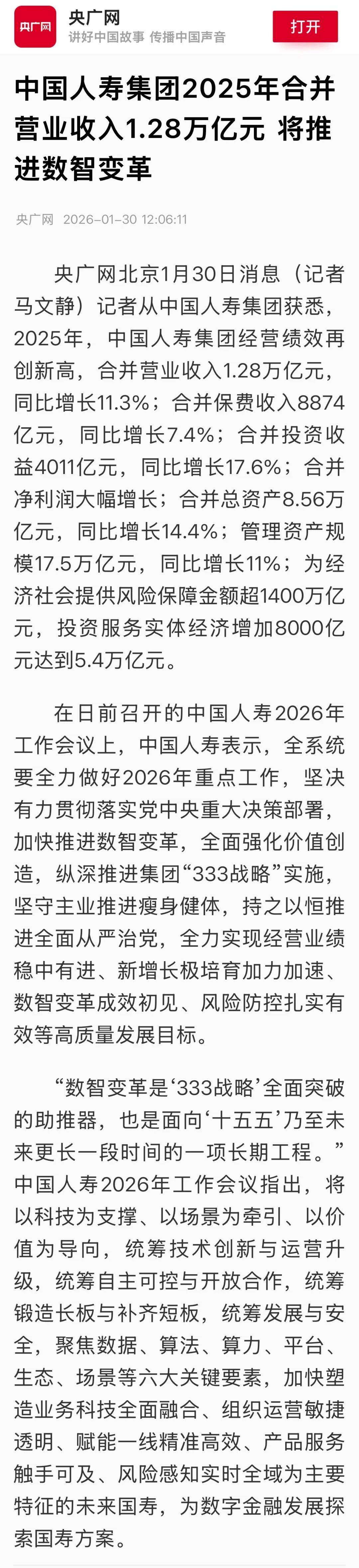 会议指出,2025年,中国人寿全系统真抓实干、攻坚克难,集团“333战略”平稳起步。经营绩效再创新高,中国人寿全集团合并营业收入1.28万亿元,同比增长11.3%;合并保费收入8874亿元,同比增长7.4%;合并投资收益4011亿元,同比增长17.6%;合并净利润大幅增长;合并总资产8.56万亿元,同比增长14.4%;管理资产规模17.5万亿元,同比增长11%。经济减震器和社会稳定器功能更好发挥,为经济社会提供风险保障金额超1400万亿元,投资服务实体经济增加8000亿元达到5.4万亿元。