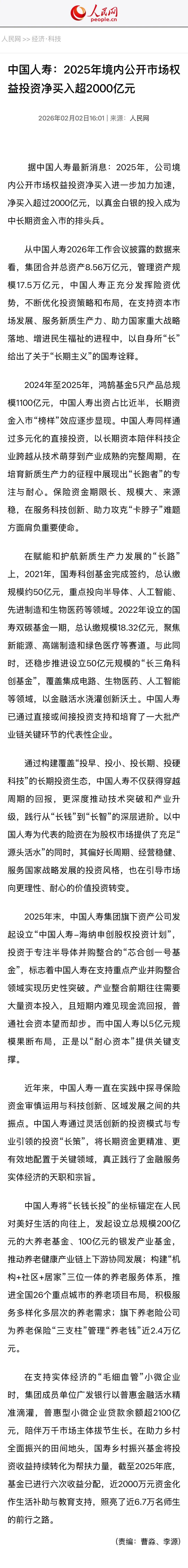 近年来,国家“引长钱、促长投”,鼓励长期资本、耐心资本发展的政策正从蓝图规划加速迈向纵深落地。在此背景下,中国人寿以险资特有的长期属性与规模优势快速响应。2025年,中国人寿境内公开市场权益投资净买入进一步加力加速,净买入超过2000亿元,成为中长期资金入市的排头兵。