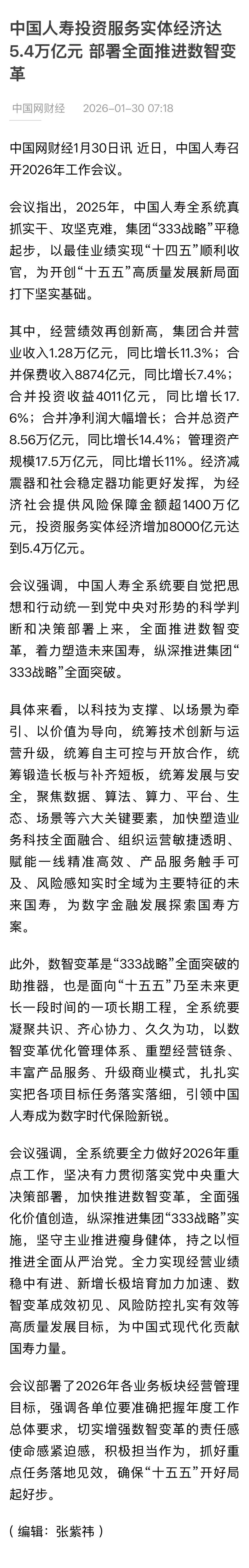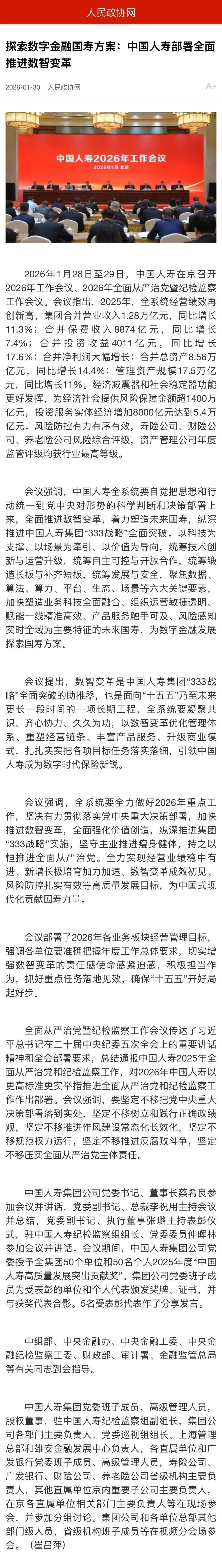 会议强调,中国人寿全系统要全面推进数智变革,着力塑造未来国寿,纵深推进集团“333战略”全面突破。会议同时强调,全系统要全力做好2026年重点工作,坚决有力贯彻落实党中央重大决策部署,加快推进数智变革,全面强化价值创造,纵深推进集团“333战略”实施,坚守主业推进瘦身健体,持之以恒推进全面从严治党。全力实现经营业绩稳中有进、新增长极培育加力加速、数智变革成效初见、风险防控扎实有效等高质量发展目标。