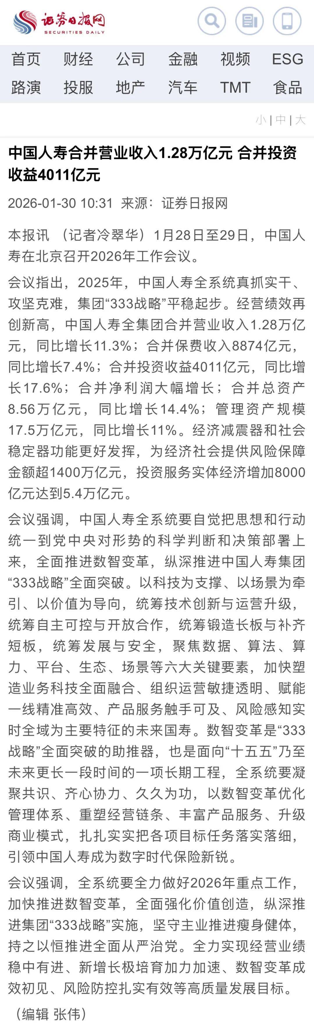 在日前召开的中国人寿2026年工作会议上,中国人寿表示,全系统要全力做好2026年重点工作,坚决有力贯彻落实党中央重大决策部署,加快推进数智变革,全面强化价值创造,纵深推进集团“333战略”实施,坚守主业推进瘦身健体,持之以恒推进全面从严治党,全力实现经营业绩稳中有进、新增长极培育加力加速、数智变革成效初见、风险防控扎实有效等高质量发展目标。