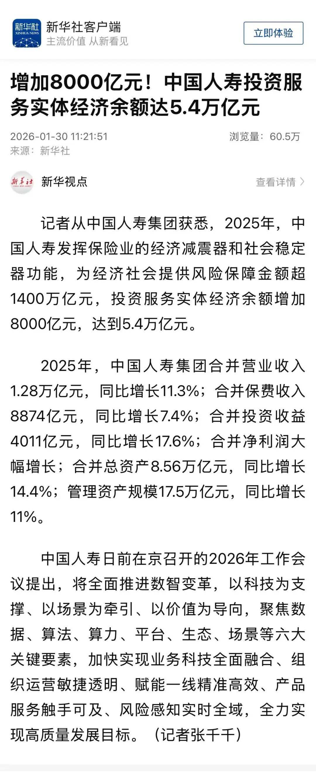 从中国人寿2026年工作会议披露的数据来看,集团合并总资产8.56万亿元,管理资产规模17.5万亿元,中国人寿正充分发挥险资优势,不断优化投资策略和布局,在支持资本市场发展、服务新质生产力、助力国家重大战略落地、增进民生福祉的进程中,以自身所“长”给出了关于“长期主义”的国寿诠释。