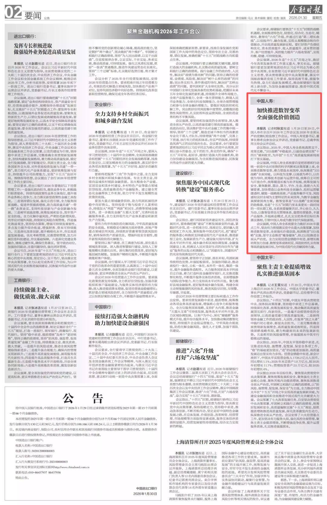 会议强调,中国人寿全系统要全力做好2026年重点工作,坚决有力贯彻落实党中央重大决策部署,加快推进数智变革,全面强化价值创造,纵深推进“333战略”实施,坚守主业推进“瘦身健体”,持之以恒推进全面从严治党。全力实现经营业绩稳中有进、新增长极培育加力加速、数智变革成效初见、风险防控扎实有效等高质量发展目标,为中国式现代化贡献国寿力量。