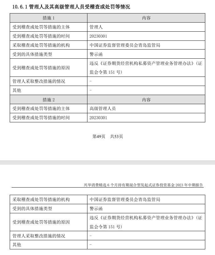 此外,兴华基金此前发布的公告还显示,公司及其相关高级管理人员于2023年3月1日因违反《证券期货经营机构私募资产管理业务管理办法》的规定,收到了中国证监会青岛监管局出具的警示函。返回搜狐,查看更多
