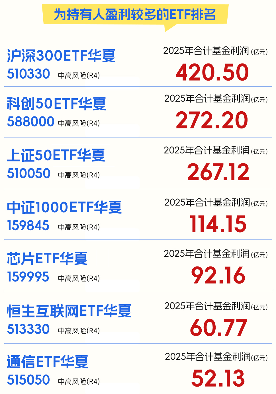 比如沪深300ETF华夏(510330)全年基金利润达420.50亿元,科创50ETF华夏,上证50ETF华夏全年利润均超200亿元。