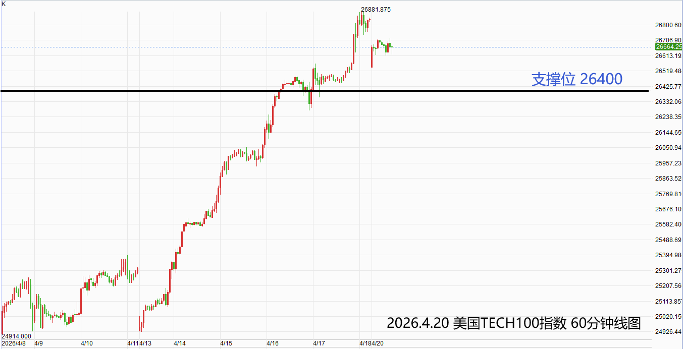 美国TECH100指数:激进者偏多操作,多单参考价26550-26600,止损位26400,获利目标26800附近/以上。